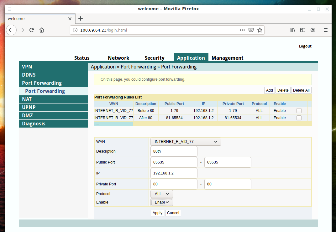 - Переадресацию порта 65535 на 80 порт адреса 192.168.1.2