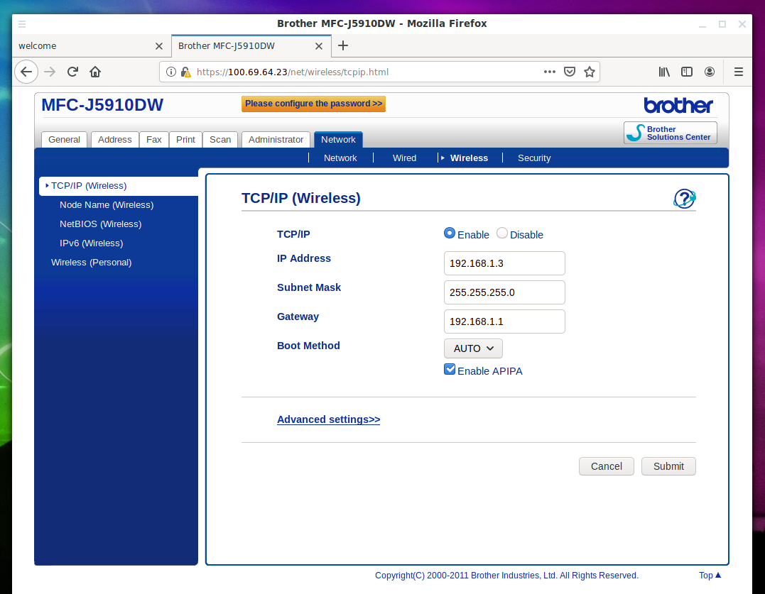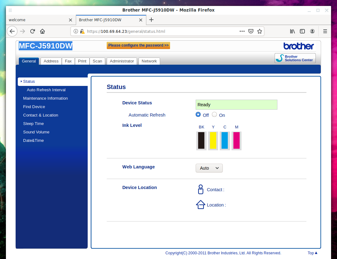 PORT STATE SERVICE VERSION 21/tcp open ftp Brother/HP printer ftpd 1.13 | banner: 220 FTP print service:V-1.13/Use the network password for the I |_D if updating. 23/tcp open telnet Brother/HP printer telnetd |_banner: \x1B[2J\x1B[1;1f 80/tcp open http GoAhead WebServer 2.5.0 (PeerSec MatrixSSL 3.4.2) |_http-server-header: GoAhead-Webs/2.5.0 PeerSec-MatrixSSL/3.4.2-OPEN 443/tcp open ssl/http Debut embedded httpd 1.20 (Brother/HP printer http admin) 515/tcp open printer 631/tcp open ipp? 9100/tcp open jetdirect? Service Info: Device: printer