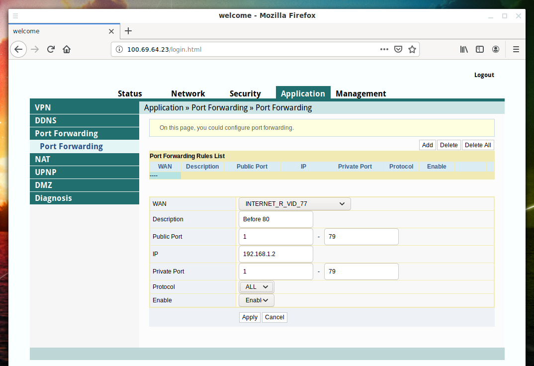 - Переадресацию портов 1-79 на 1-79 порты адреса 192.168.1.2