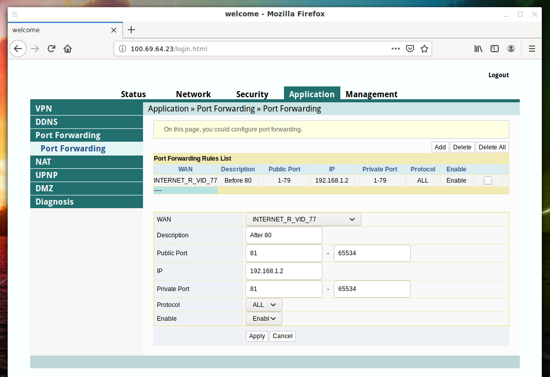 Например, на рассматриваемом роутере эту вкладку я нашёл по пути Application → Port Forwarding: