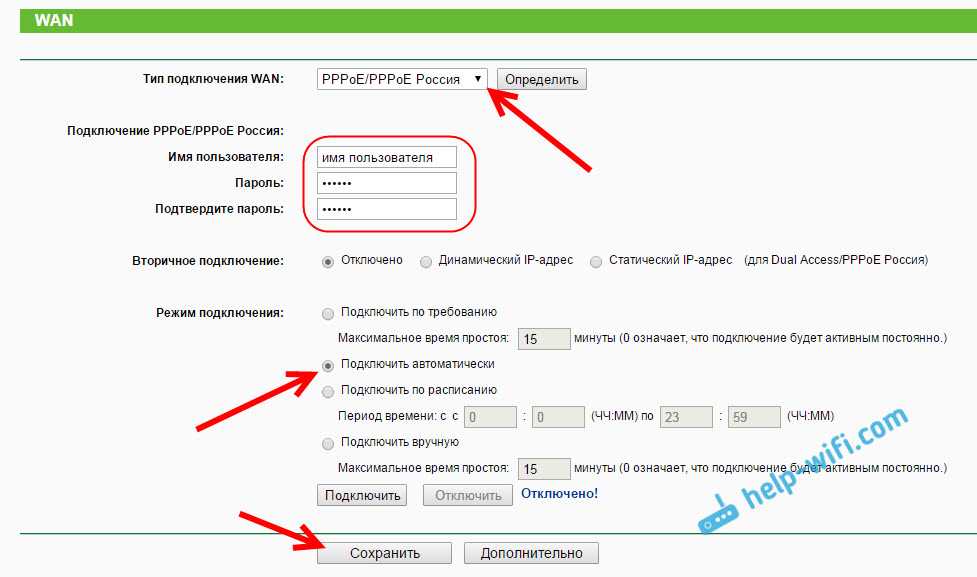 Достаточно выбрать PPPoE, указать имя пользователя и пароль, выставить обязательно автоматическое подключение, и сохранить настройки.