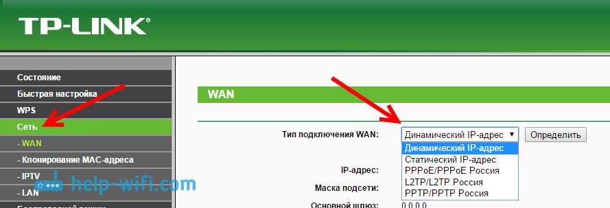 В настройках открываем вкладку Сеть – WAN, и в выпадающем меню Тип подключения WAN выбираем подключение, которое использует наш провайдер (если вы подключились через модем, то выберите Динамический IP, и сохраните настройки).