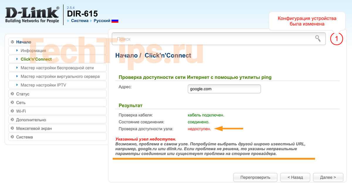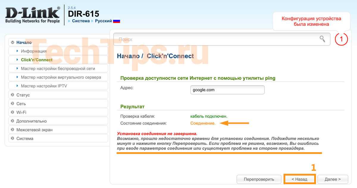 Основная навигация по конфигурациям расположено слева — в меню настроек нам надо найти пункт «Начало — Click’n’Connect». Тут за несколько шагов мы сможем быстренько настроить наш D-Link. Первое — «Подключите Ethernet-кабель провайдера к WAN-порту (Internet) устройства» — мы уже сделали