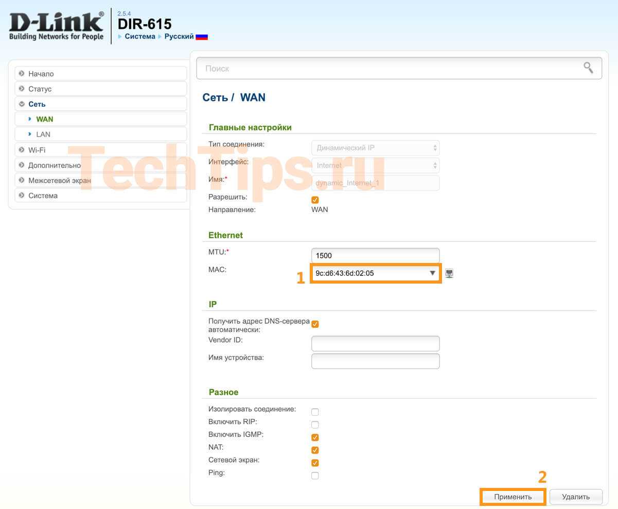 Сменить MAC-адрес можно и без предупреждения провайдера. Для этого достаточно поменять этот параметр на устройстве. Это делается через веб-интерфейс D-Link DIR-615 во вкладке “WAN”. В открывшемся окне в разделе “Ethernet” указан текущий MAC. Справа находятся кнопки “Клонировать” или “Восстановить по умолчанию”. Второй кнопки может и не быть в зависимости от версии прошивки.