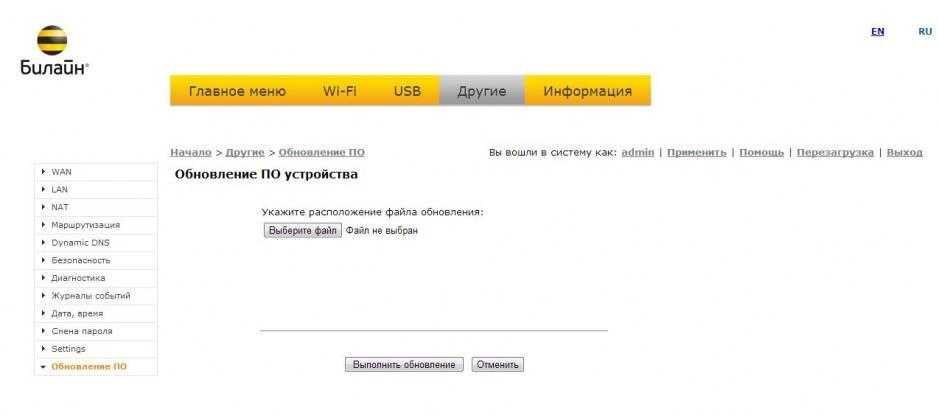 4. Появится страница с расширенными настройками роутера. В меню слева, нажмите Обновление ПО. Нажимайте на кнопку Выберите файл и с помощью обзора выберите расположение скаченного файла. Далее можете нажать кнопку Выполнить обновление.