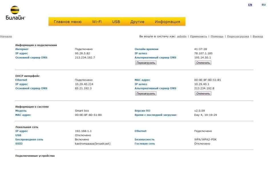 Пункт “Домашний Интернет” служит для подключения к сети оператора Beeline. Так как все требуемые параметры уже содержатся в установленном ПО (прошивка), пользователю потребуется лишь ввести пароль и имя (оба значения – admin).