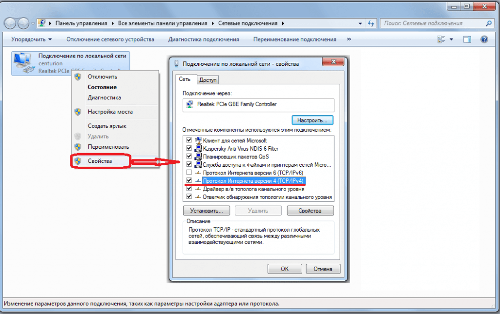 Откроется окно «Свойства подключения по локальной сети». Здесь нужно выбрать компонент «Протокол Интернета версии 4(TCP/IPv4)» и кликнуть на нем дважды.