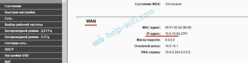 Нужно для начала зайти в настройки своего Wi-Fi роутера, и прямо на главной странице (обычно, это’Карта сети’, или ‘Состояние’), или в разделе WAN (Интернет) посмотреть WAN IP-адрес, который присвоен роутеру интернет-провайдером. Вот, например, на роутере TP-Link: