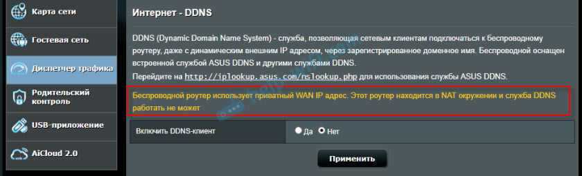 Некоторые маршрутизаторы могут сами определять, какой IP-адрес выдает провайдер. Приватный (серый), или публичный (белый). Так, например, на роутерах ASUS, если адрес серый, то в разделе с настройками DDNS отображается следующее предупреждение: ‘Беспроводной роутер использует приватный WAN IP адрес. Этот роутер находится в NAT окружении и служба DDNS работать не может’.