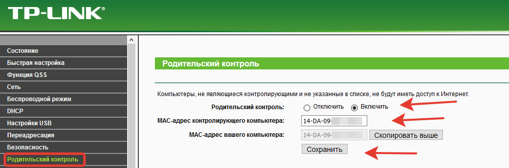 Заходим в пункт меню «Родительский контроль» и ставим переключатель в положение «Включить» или Enable. Далее нужно вписать в поле ниже МАС-адрес компьютера, с которого вы будете управлять функцией, чтобы настройки нельзя было поменять с других устройств. Скорее всего, вы вошли в веб-интерфейс как раз с этого компьютера, поэтому можете просто нажать кнопку «Скопировать выше».