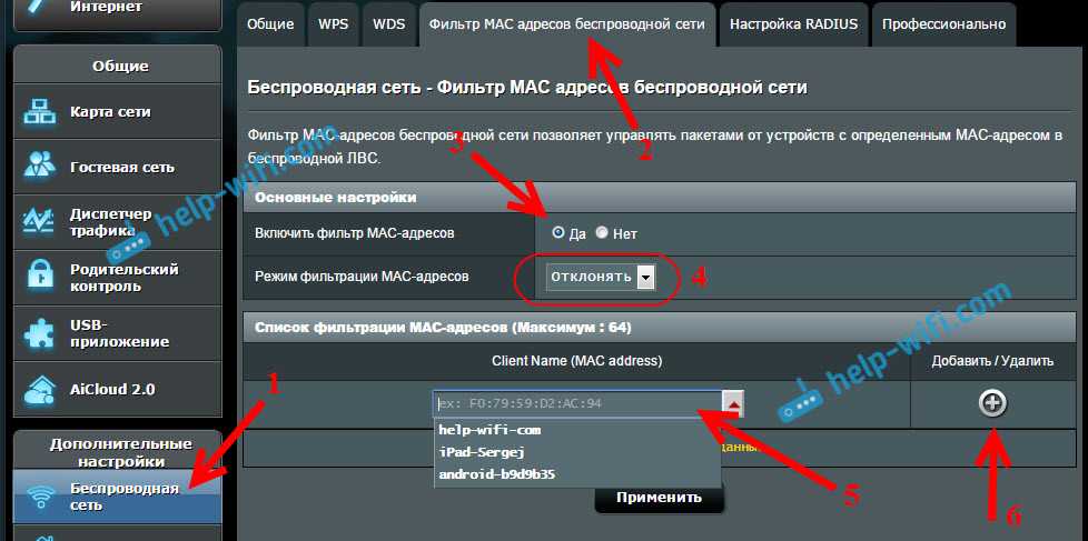 - Перейти в «Черный список» и ввести MAC-адрес устройства, которое нужно заблокировать.