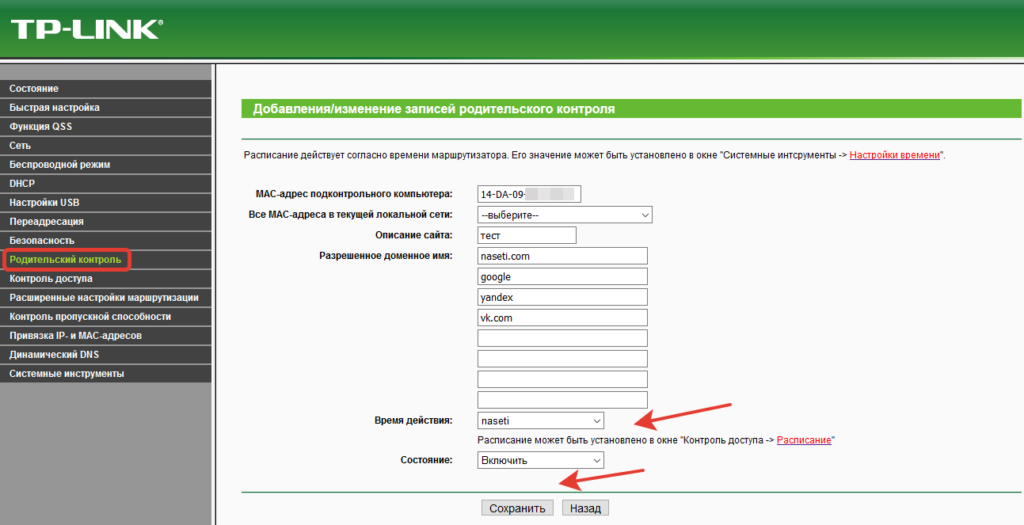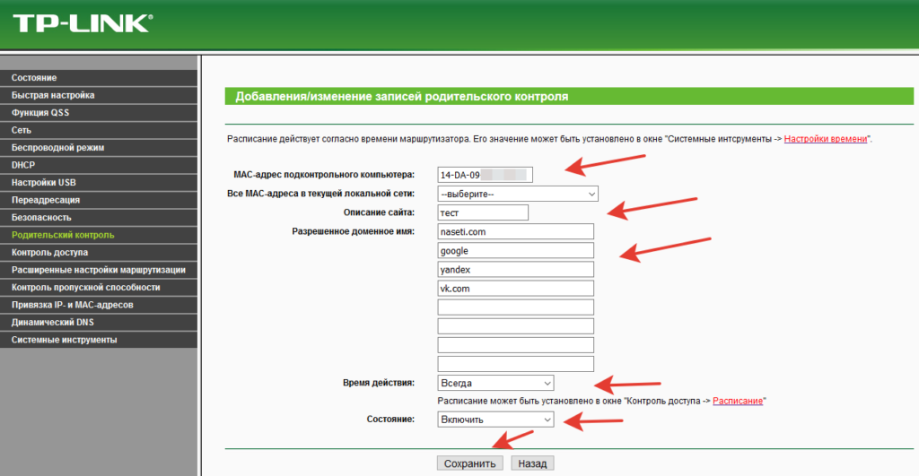 Вы можете разрешить доступ к сайтам для этого устройства. Для этого в поле «Описание сайта» пишете любое слово английскими или русскими буквами. Например, мы его обозначили как “тест”. Главое, чтобы описание было уникально. Далее, в поля «Разрешенное доменное имя» (их здесь восемь) впишите адреса сайтов. Писать адрес сайта полностью необязательно. Достаточно вписать в поле, например, google – и доступ ко всем сайтам, в адресе которых есть это слово, будет разрешён.