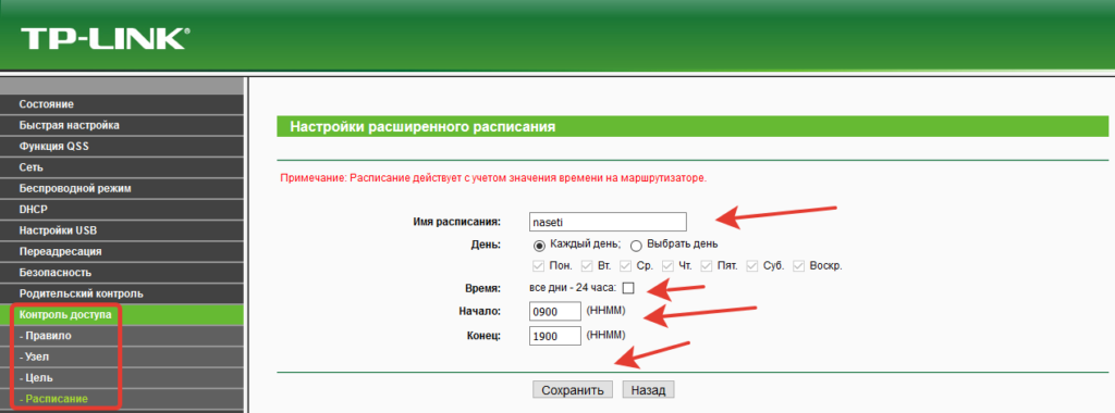 Если же нужно установить расписание для созданного правила, сделать это можно, кликнув на ссылку «Расписание» над окошком «Состояние». Либо перейдя в раздел «Контроль доступа» – «Расписание». Здесь вы можете создать нужное расписание – вписываете в поле «Имя расписания» любое слово, например, naseti. И указываем в какие дни и в какое время будет работать правило доступа.