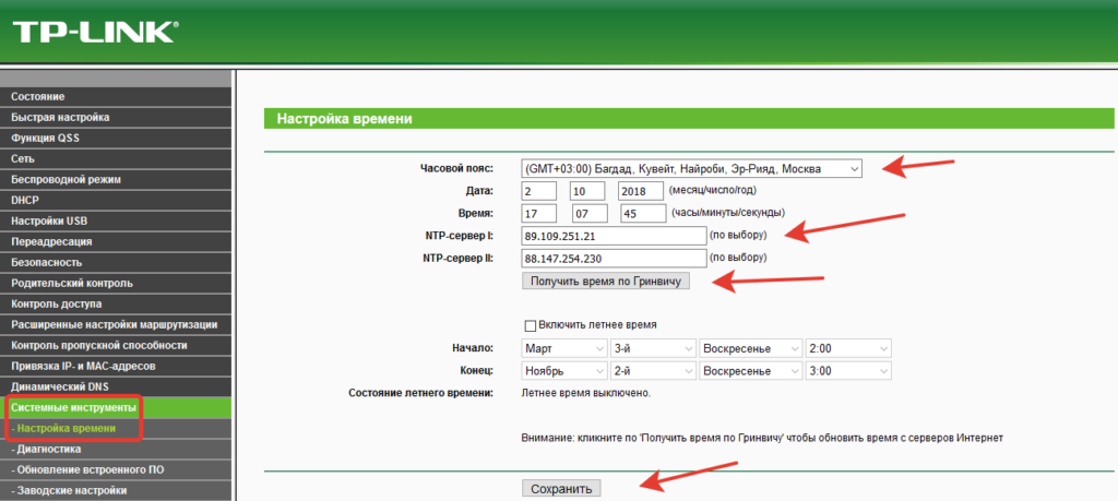 Здесь следует выбрать часовой пояс. Затем прописываем IP-адреса NTP-серверов (основной и запасной – на всякий случай). После этого нажимаем кнопку “Получить время по Гринвичу”. Сервера автоматически сохранятся и выставится точное время.