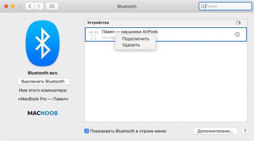 Проверяем, включен ли Bluetooth на нашем Макбуке. Наушники должны появится в списке доступных устройств. Просто нажмите на кнопку «Подключить».