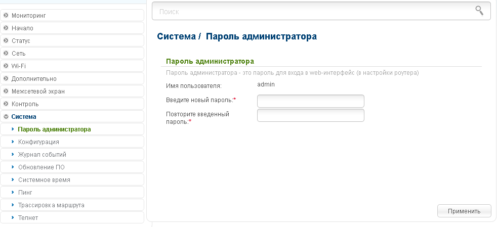 Если после этого вы захотите изменить пароль, сделать это можно в разделе «Система — Пароль администратора». Для это в поля «Введите новый Пароль» и «Повторите введенный пароль» введите новый пароль для доступа на маршрутизатор и нажмите «Применить»: