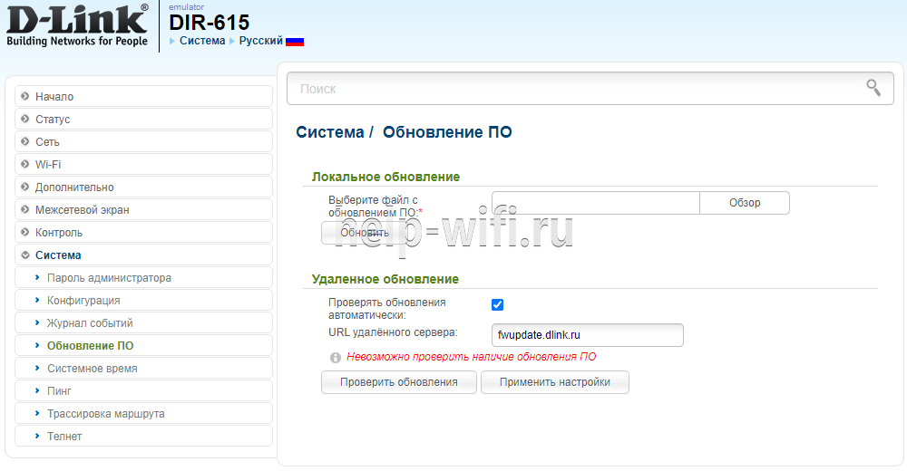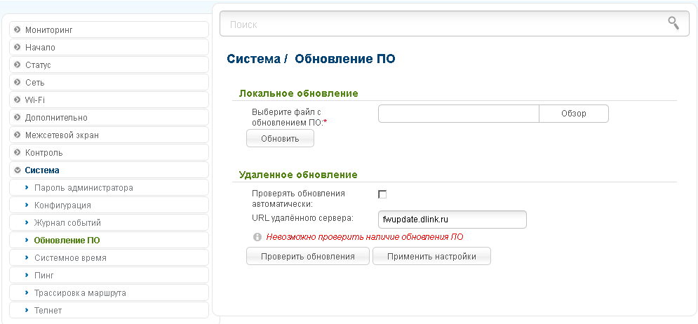 Произведенных настроек достаточно для выхода в сеть Интернет, но для более стабильной и качественной работы рекомендуется обновить версию микроконтроллера маршрутизатора. Сделать это можно в разделе «Система — Обновление ПО». Вы можете либо нажать клавишу «Проверить обновления» и маршрутизатор самостоятельно обновит прошивку до последней версии, либо скачать последнюю версию с FTP-сервера D-Link по адресу http://ftp.dlink.ru/pub/Router/DIR-615/Firmware/RevN/ и обновить прошивку вручную в пункте «Локальное обновление»: