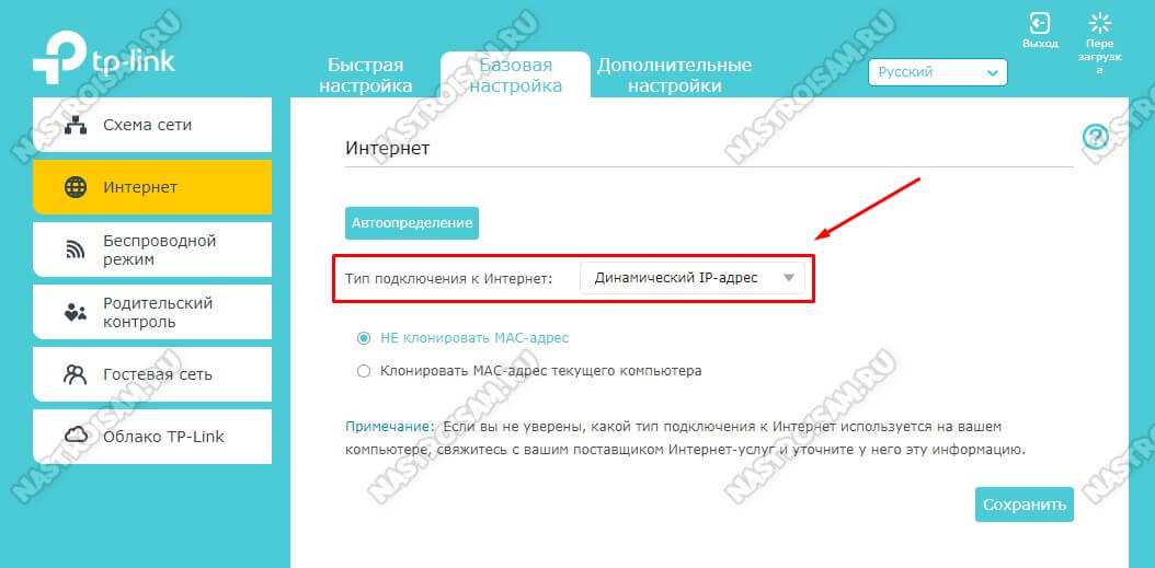 - В админ-панели следует выбрать «Динамический IP», если подключен кабель LAN непосредственно от ранее настроенного роутера к TL-R480T+. Он будет автоматически получать настройки через DHCP. Если напрямую подключается WAN-соединение, такое как PPTP, то нужно сделать соответствующие настройки.