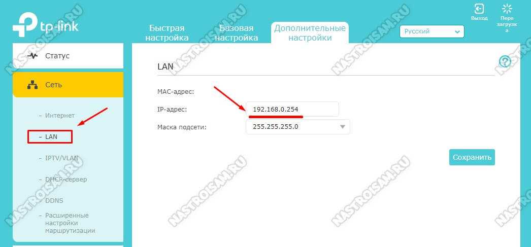 Зайдите в настройки подключаемого роутера и первым делом перейдите на вкладку «Сеть» — «Локальная сеть». Если ваши сетевые устройства в локальной сети имеют одинаковый IP-адрес, то второму устройству во избежание конфликтов, нужно присвоить другой IP или сменить подсеть.