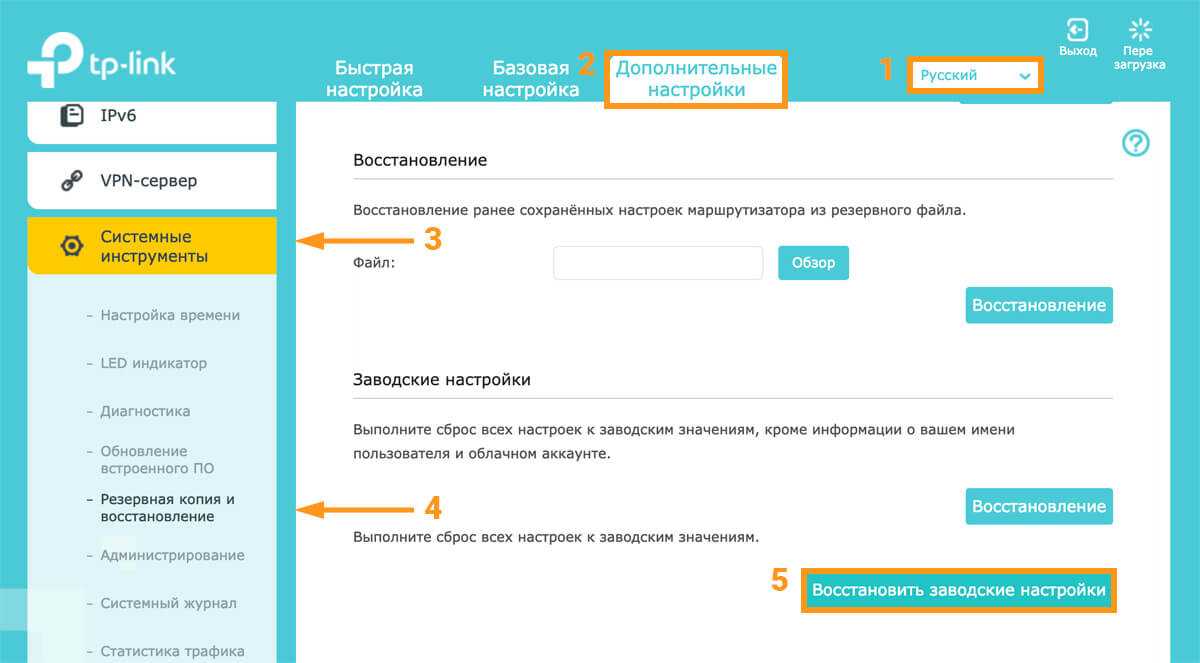 В новой панели управления прошивка многоязычная. Выберите Русский язык. Зайдите в «Дополнительные настройки» – «Системные инструменты» – «Резервная копия и восстановление». Нажмите «Восстановить заводские настройки». Затем «ОК» на предупреждении о сбросе.