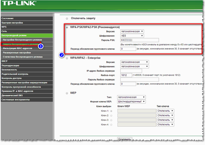 После чего необходимо открыть вкладку «Защита беспроводной сети» (или на англ. «Wireless Security») и выбрать тип защиты.