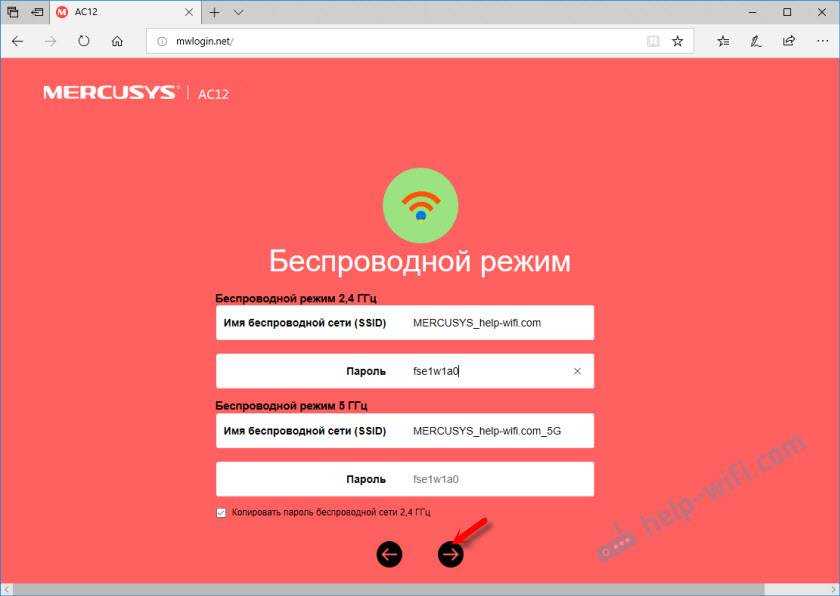 Здесь можно сменить имя беспроводной сети в обоих диапазонах и установить пароль на Wi-Fi. Чтобы на сеть в диапазоне 5 ГГц поставить другой пароль, нужно убрать галочку с пункта “Копировать пароль беспроводной сети 2.4 ГГц”.