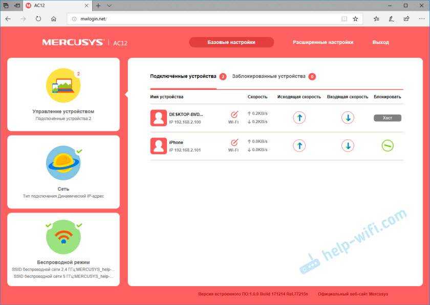 На главной странице, слева находится три вкладки: «Управление устройствами» – где можно посмотреть какие устройства подключены к роутеру, ограничить для них скорость, или заблокировать/разблокировать их. «Сеть» – где можно сменить основные настройки подключения к интернету (провайдеру). «Беспроводной режим» – где можно отключить Wi-Fi сеть, сменить имя сети и пароль.