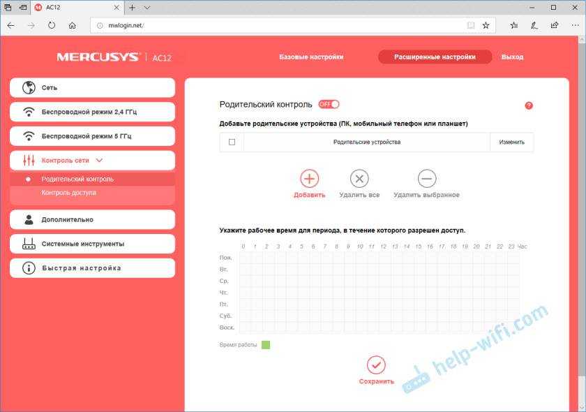 Родительский контроль. Если необходимо, можно настроить родительский контроль. Добавить устройство и задать время, когда это устройство сможет получать доступ к интернету.