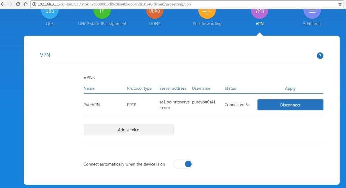 Не забудьте поставить переключатель «Connect automatically…» в положение «On», тогда VPN-соединение будет активироваться автоматически поверх интернета от вашего провайдера каждый раз сразу после включения/перезагрузки роутера.