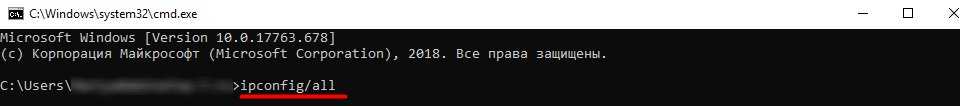 Далее введите ipconfig/all и подтвердите ввод.