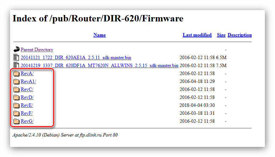 После определения аппаратной версии устройства переходите к FTP-серверу D-Link; для удобства мы даём прямую ссылку на директорию с прошивками. Найдите в ней каталог вашей ревизии и заходите в него.