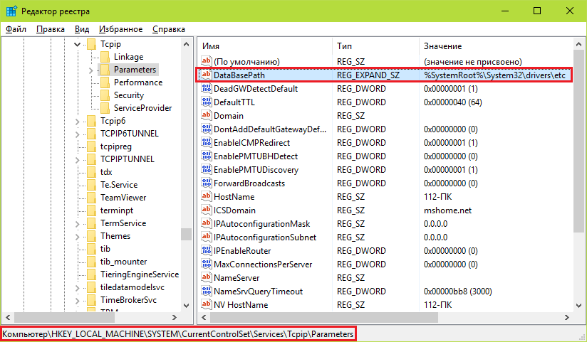 Второй вариант — это перемещение файла Hosts в другое, более укромное место. Куда его поместить, решайте сами, но чтобы система его не потеряла, придется внести небольшую правку в реестр. Откройте в редакторе RegEdit ветку HKEY_LOCAL_MACHINE\SYSTEM\CurrentControlSet\Services\Tcpip\Parameters и в значении параметра DataBasePath пропишите новый путь к Hosts.