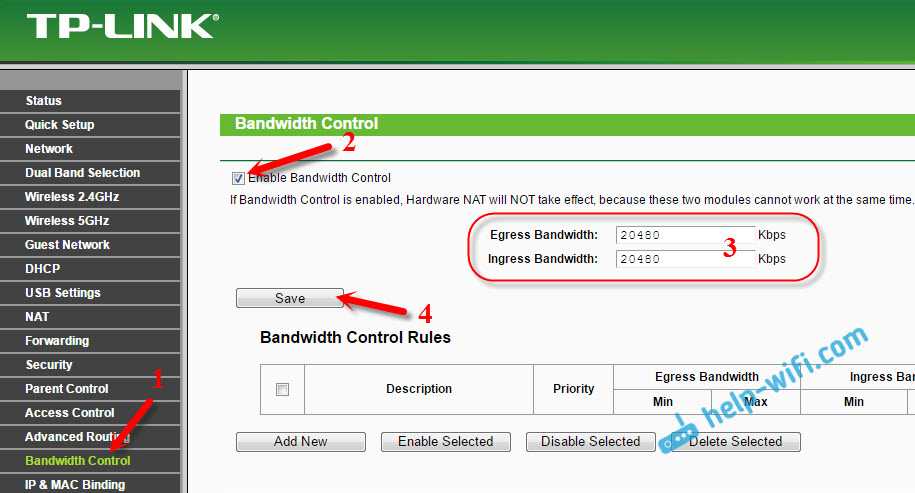 В настройках маршрутизатора нужно открыть вкладку «Bandwidth Control» (Контроль пропускной способности), поставить галочку возле пункта «Enable Bandwidth Control» (Включить контроль полосы пропускания).