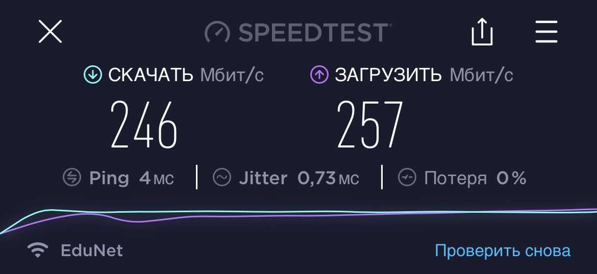 Сначала в серверной я подключил только один модуль Halo H50G. Вот замер скорости недалеко от него. Замерял на iPhone 13 Pro c помощью Ookla: