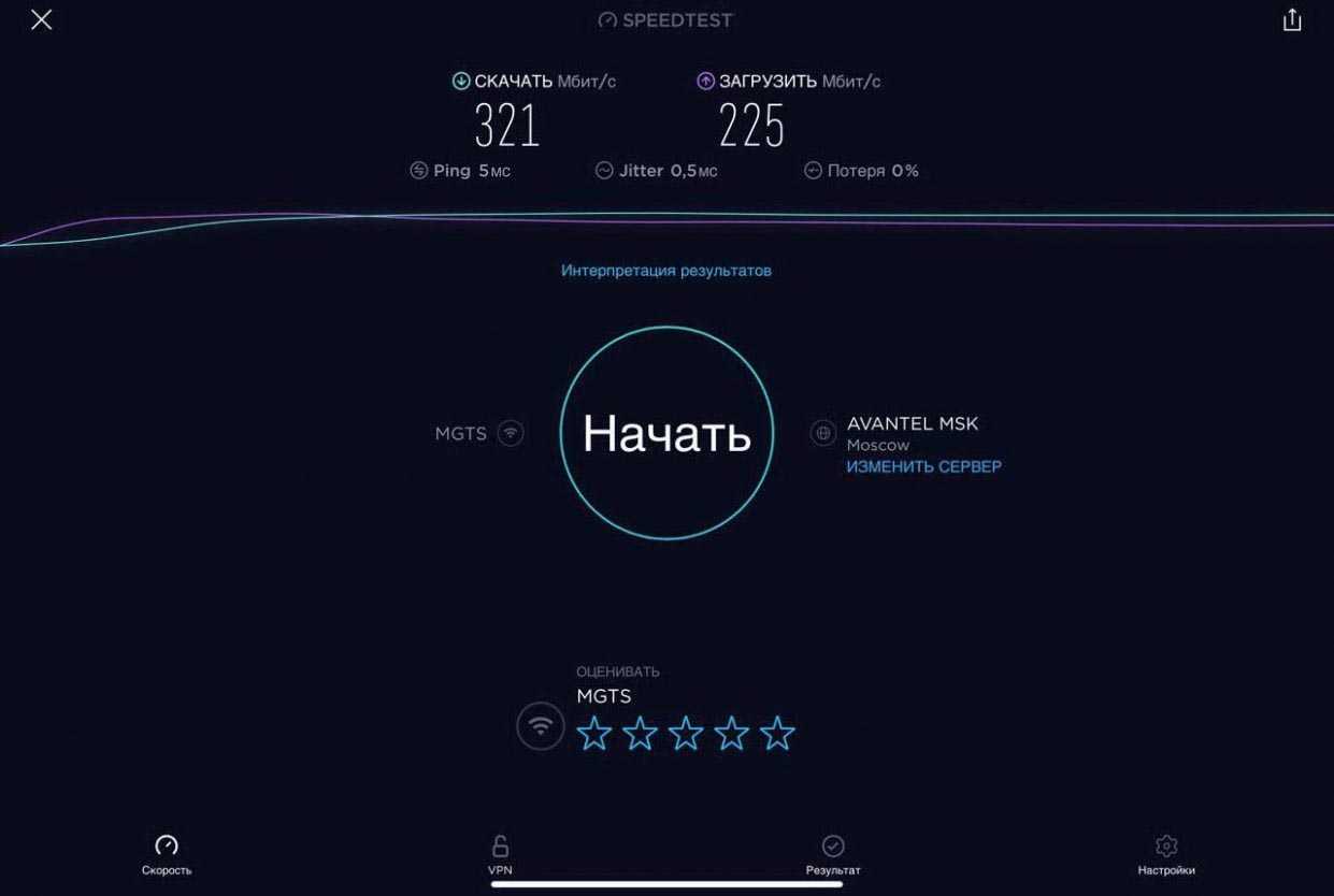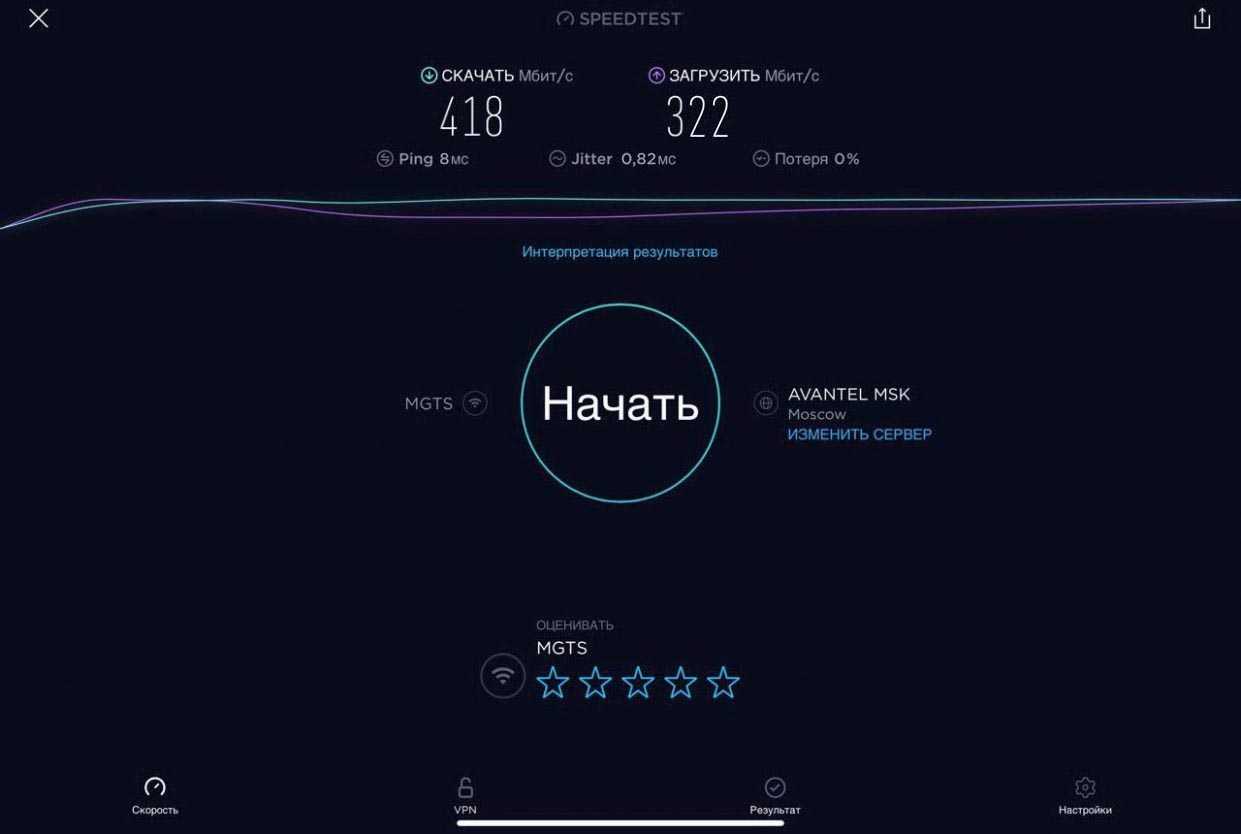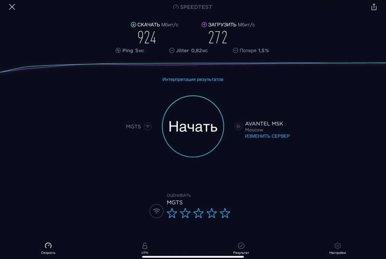 Для проверки работы Mercusys MR50G была проведена серия тестов скорости интернета на iPad Pro для каждого диапазона при подключении проводного интернета скоростью в 1 Гбит/с (G-PON МГТС в дневное время) при минимальном влиянии соседних роутеров.