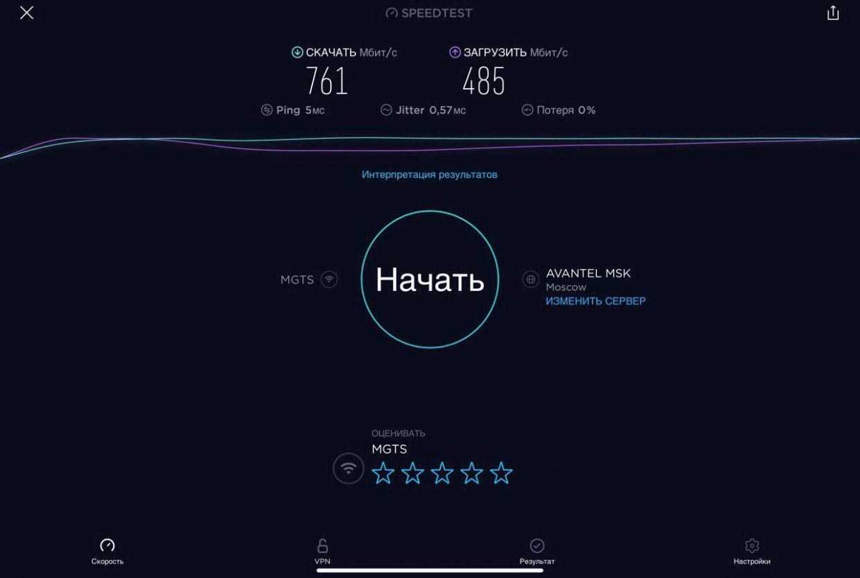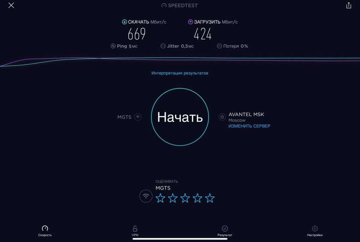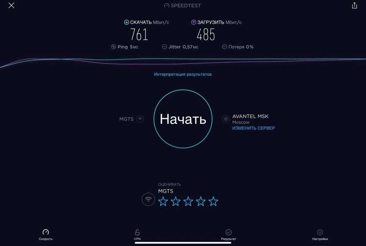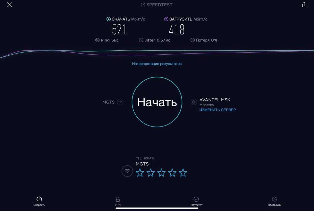 Для проверки работы Mercusys MR50G была проведена серия тестов скорости интернета на iPad Pro для каждого диапазона при подключении проводного интернета скоростью в 1 Гбит/с (G-PON МГТС в дневное время) при минимальном влиянии соседних роутеров.