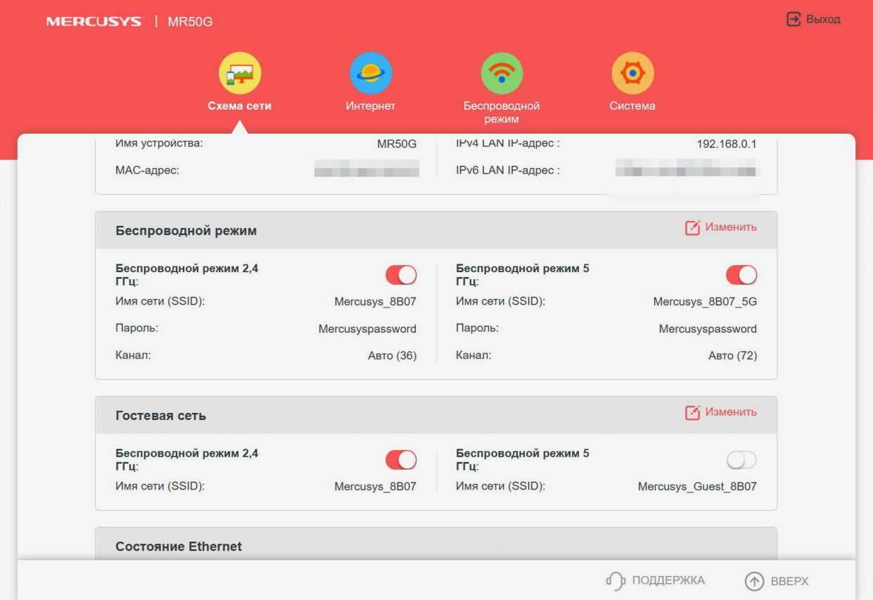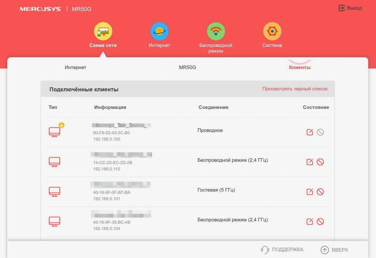 Текущее состояние, параметры и подключенные устройства наглядно показаны на главной вкладке «Схема сети». Конечно, гостевой доступ, черный список и тоже есть.