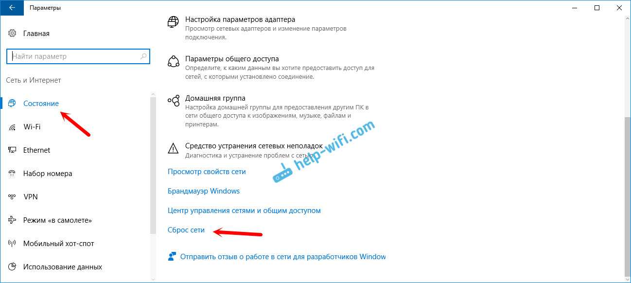 Зайдите в параметры, в раздел «Сеть и Интернет». На вкладке «Состояние» нажмите на «Сброс сети».