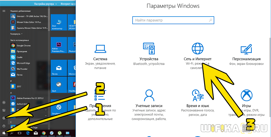 Если все условия соблюдены, то приступим к созданию точки доступа на ноутбуке c Windows 10. Для этого идем в меню «Пуск», заходим в «Параметры» и в новом открывшемся окне выбираем «Сеть и Интернет»