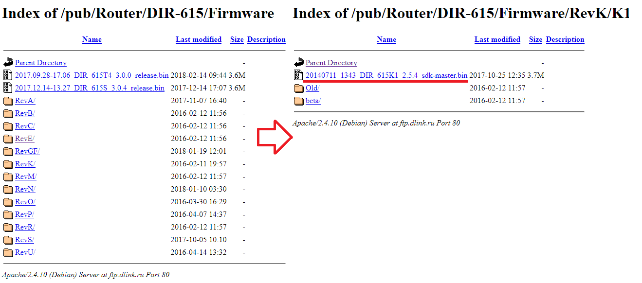Необходимо перейти на официальную страницу, где представлены прошивки для DIR 615. Среди папок откройте ту, которая соответствует букве с этикетки вашего роутера. В ней вам необходимо скачать файл формата .bin