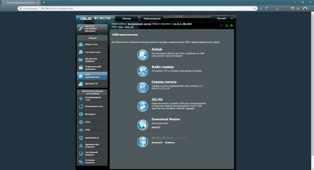 Для этого первым делом нужно зайти в настройки маршрутизатора по адресу 192.168.1.1 (если возникнут проблемы, изучите статью: «как зайти на роутер Asus» и общую статью с исправлением ошибок: «192.168.1.1«, а затем открыть USB-приложение — Файл/Медиа-сервер.