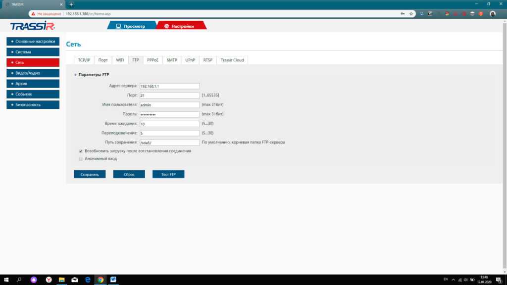 Перейдя в сетевые настройки камеры видеонаблюдения надо прописать адрес 192.168.1.1, а также указать номер порта – 21.В окошке ввода имени пользователя и пароля используем в обоих случаях — admin.Теперь потребуется указать папку для хранения файлов.