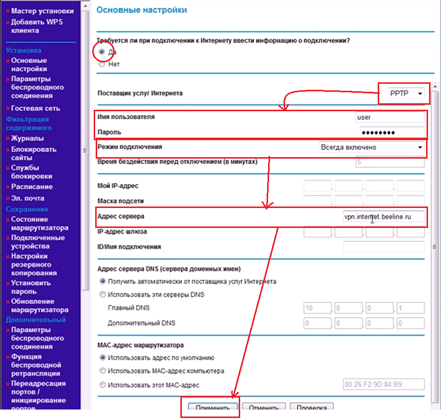 Интернет провайдер может работать посредством различных протоколов. Если он предоставляет соединение PPTP, то придется выполнить следующие инструкции. В графе «Основные настройки» необходимо выбрать поставщика интернет услуг. В выпадающем меню необходимо отметить пункт PPTP. В договоре с провайдером должны быть прописаны имя пользователя и пароль для него. Если таковых данных не имеется, то придется связаться с технической поддержкой провайдера и получить сведения. Если в ходе настройки вы будете соблюдать все предписания, но сеть так и не заработает, возможно это повод узнать от провайдера недостающие параметры конфигурации, типа IP-адреса или DNS-серверов.