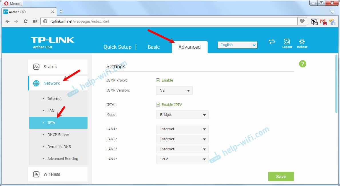 Настройки IPTV задаются в разделе ‘Advanced’ – ‘Network’ – ‘IPTV’.