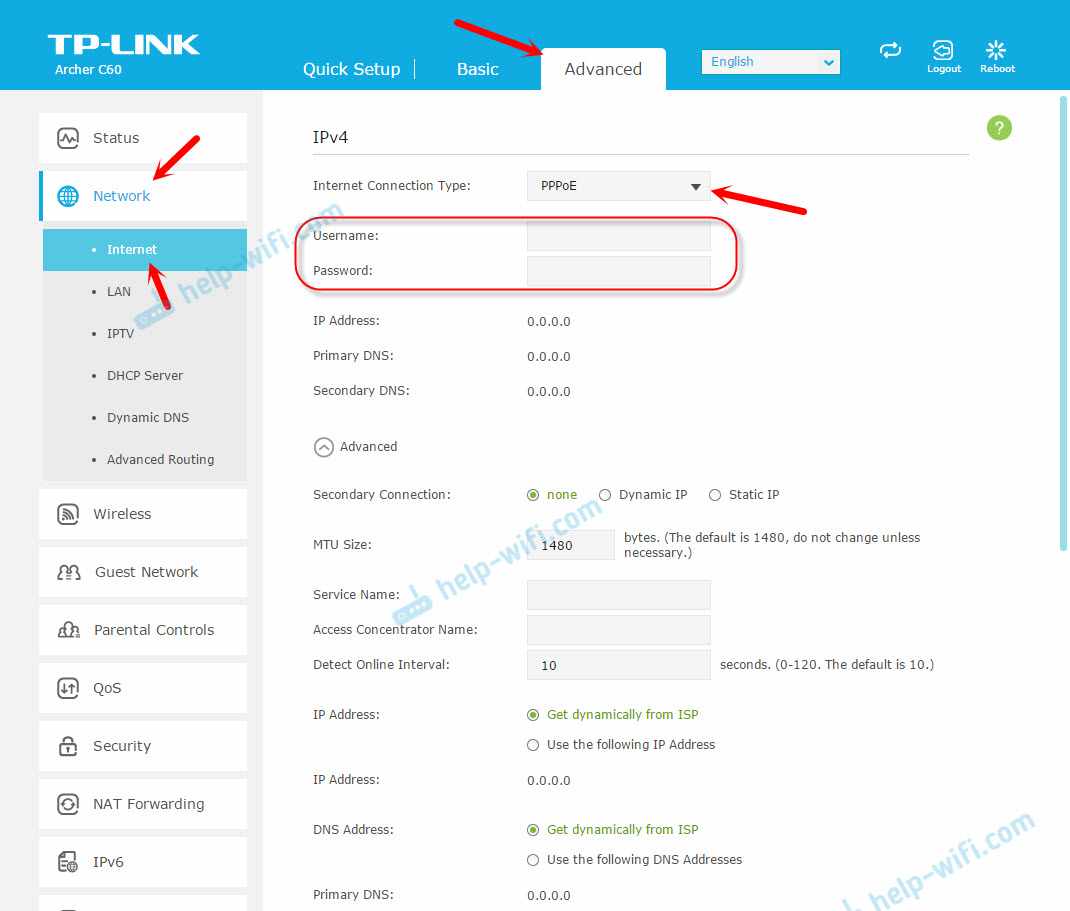 Если же интернет через роутер не работает (без доступа к интернету, или ограничено), то нужно задать параметры для подключения к провайдеру. Для этого перейдите на вкладку ‘Advanced’ – ‘Network’ – ‘Internet’.