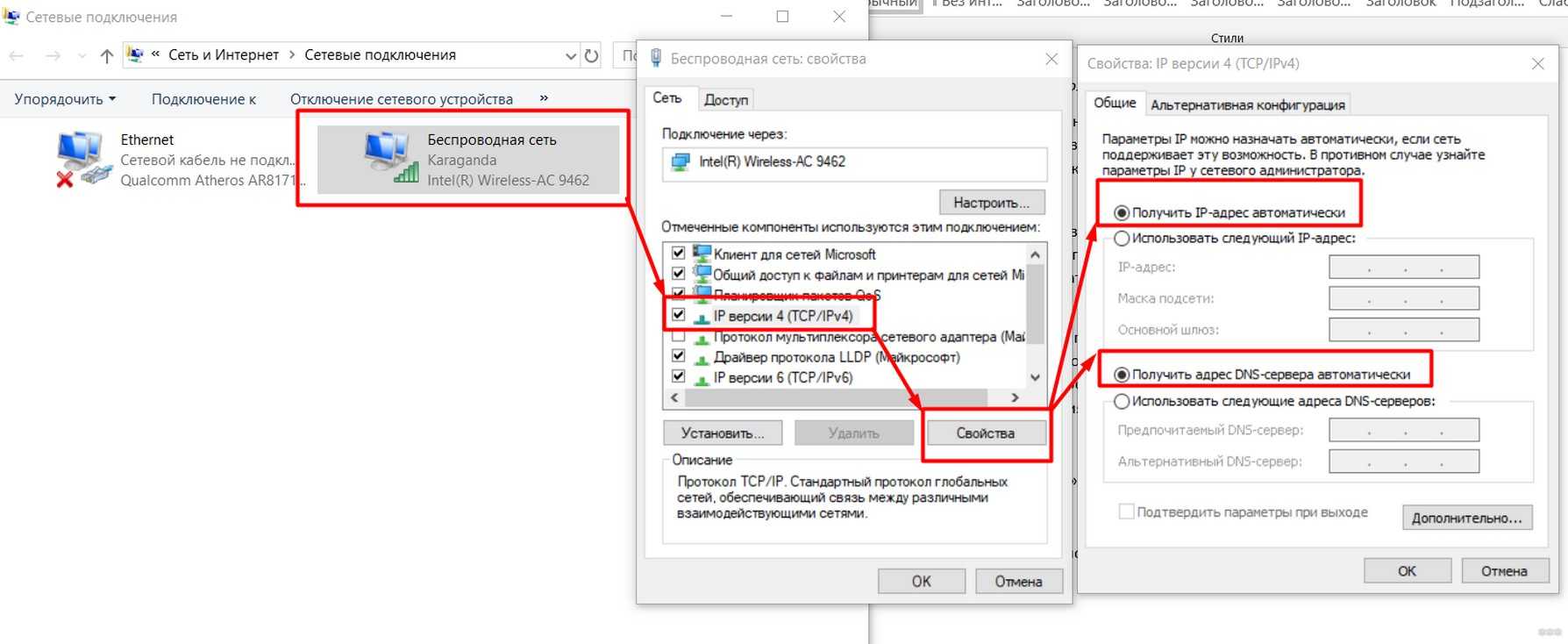 - Находим наш сетевой беспроводной адаптер, правой кнопкой –«Свойства». А далее как на рисунке: