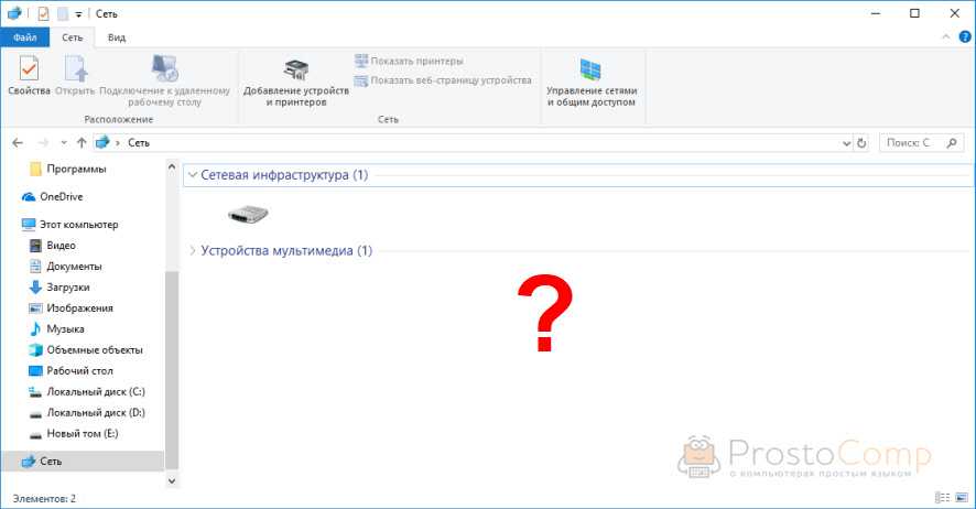 Открываем мы значит вкладку «Сеть» в проводнике Windows 10, где должны отображаться все сетевые устройства. Но видим там в лучшем случае свой Wi-Fi роутер, свой компьютер и может еще какие-то устройства мультимедиа. Другие компьютеры в локальной сети и сетевые папки не отображаются. А с других компьютеров они обычно видны и можно на них зайти. В том числе на этот компьютер с установленной Windows 10.