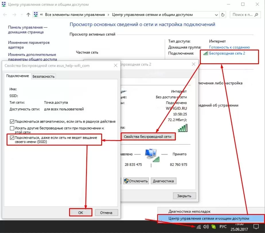 Откройте «Центр управления сетями и общим доступом» и нажмите на свою Wi-Fi сеть. В новом окне нажимаем на кнопку «Свойства беспроводной сети» и ставим галочку возле «Подключаться, даже если сеть не ведет вещание своего имени (SSID)». Нажимаем Ok.
