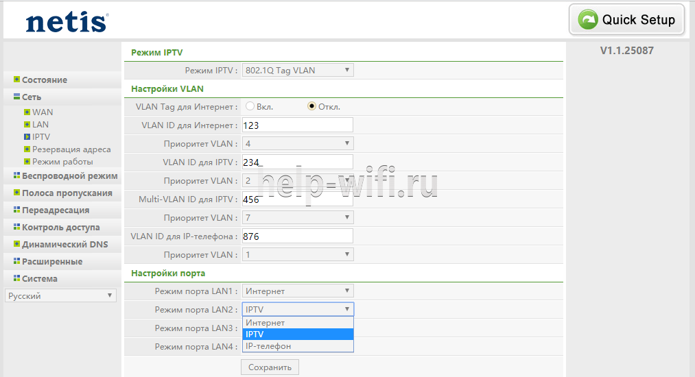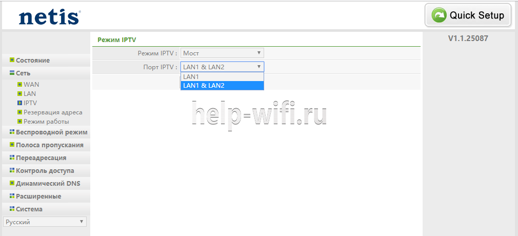«Режим IPTV» — мост. После этого страница меняется, предлагается возможность выбора порта. В отличие от многих конкурентов, которые для ТВ трафика предлагают последний порт, Netis поступает иначе.