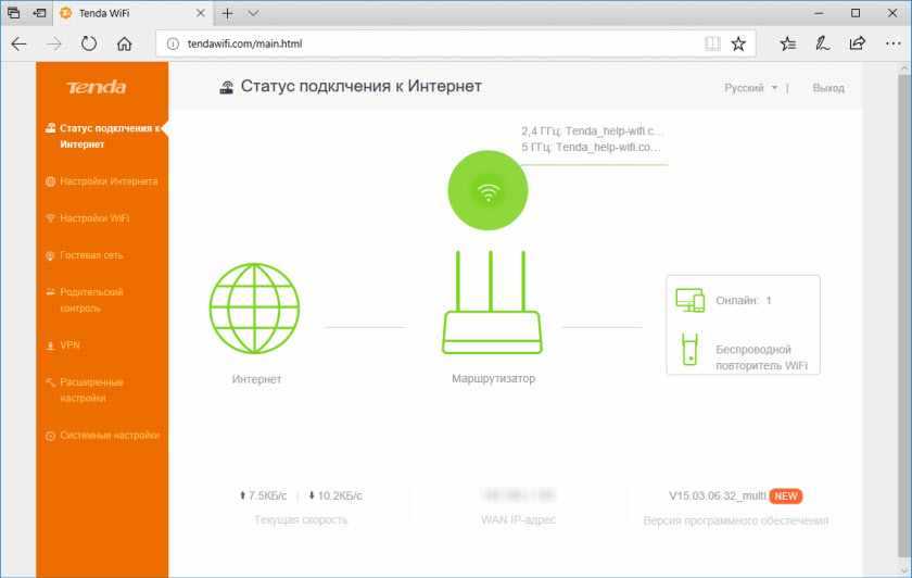 На главной странице админки отображается текущая информация о работающих сетях, о подключенных девайсах и скорости.